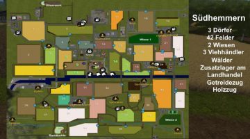 There have been created 42 fields, of which you are at the beginning. 4 There are 2 large meadows, which are not defined as fields, so that they can not be edited with a Helder (which is done deliberately so). By the middle of the map of Midland Canal runs from west to east with 5 bridges.