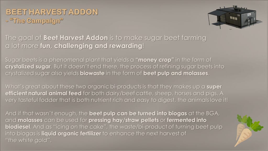 The goal of Beet Harvest Addon is to make sugar beet farming a lot more fun, challenging and rewarding!