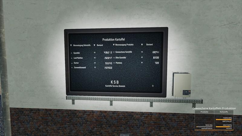 In this potato factory, potatoes are processed into 3 other products. These 3 products are premium potatoes, baked potatoes and french fries, and can later be sold at different locations / dealers. The acquisition costs for this building are € 175,000 and daily operating costs of € 500 are due. It should be noted in order to manage this production it is necessary to add other mods as empty pallets, cardboard and sunflower oil are required. For premium potatoes you only need potatoes and empty pallets. For the baked potato you need potatoes, empty pallets and cardboard. For french fries you need potatoes, empty pallets, cardboard boxes and sunflower oil.