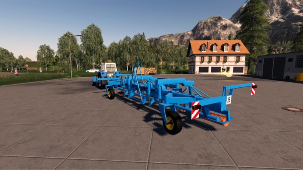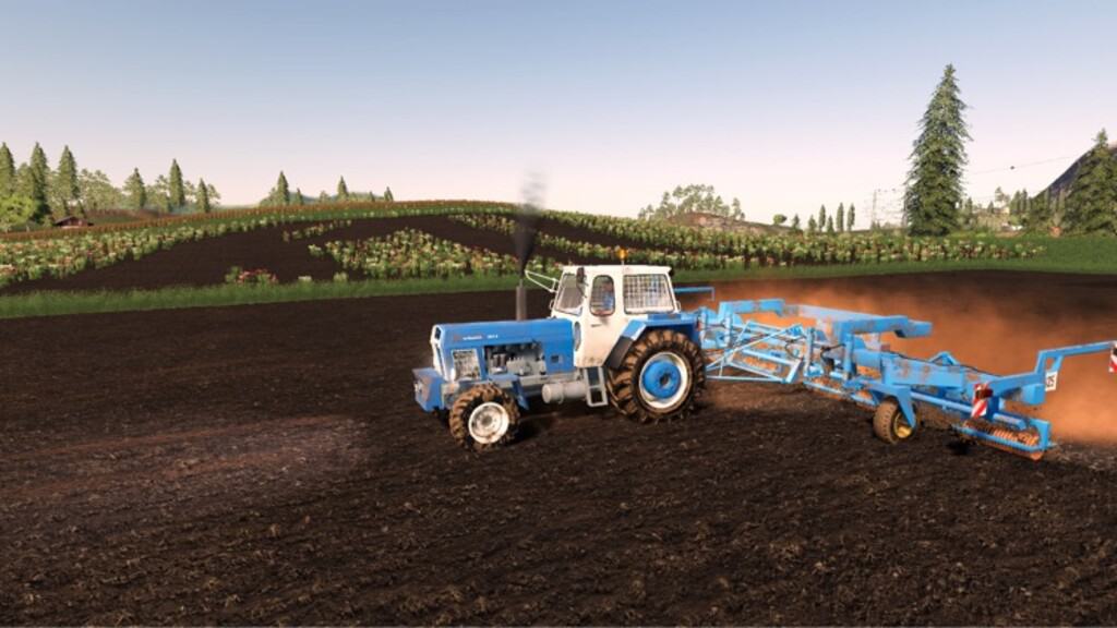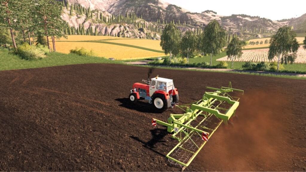 The T 890 is used to carry and pull machines and implements for field farming. The coupling wagon can take up to 3 individual implements and use them for field work. This means that larger areas can be cultivated with the same working time. The machines and devices remain in the coupling trolley even during road transport. The B435 Cambridge rollers are used for seedbed preparation in spring and autumn, in the game they are used to fertilize fields. The Attachment harrow carrier B 391 served as a support frame for harrows these are removed from weeds or used for fertilization. After purchasing the coupling trolley and 3 attachments, the coupling trolley is moved backwards over the center of the attachments and individually coupled. When you arrive at the field, the coupling trolley is unfolded, each attachment is then lowered individually, then the coupling trolley is lowered. The drawbar for road transport can be folded up with the right mouse button while working in the field.