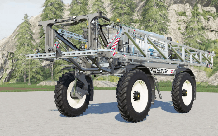 Hardi Rubicon self-propelled sprayer for transporting and surfacely injecting liquid mineral fertilizers and herbicides into the soil by irrigation, for Farming Simulator 19.