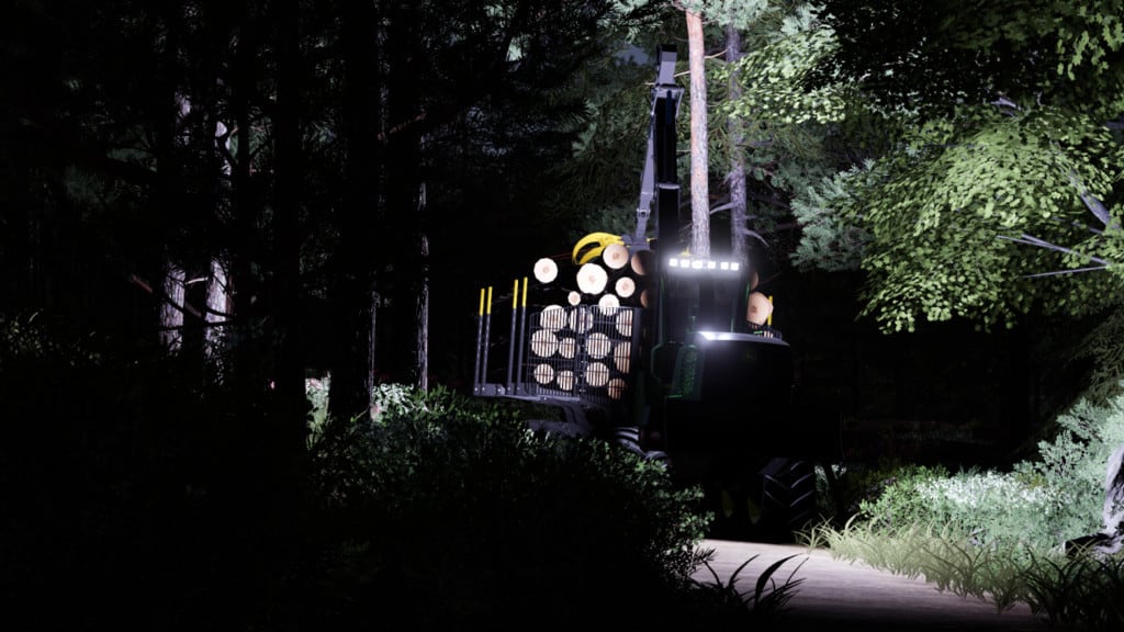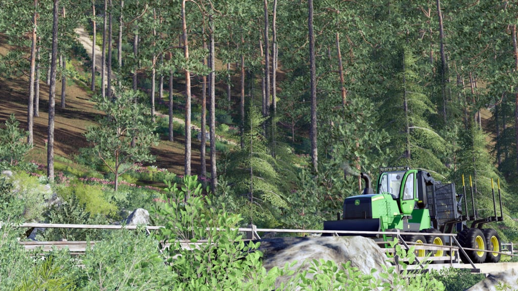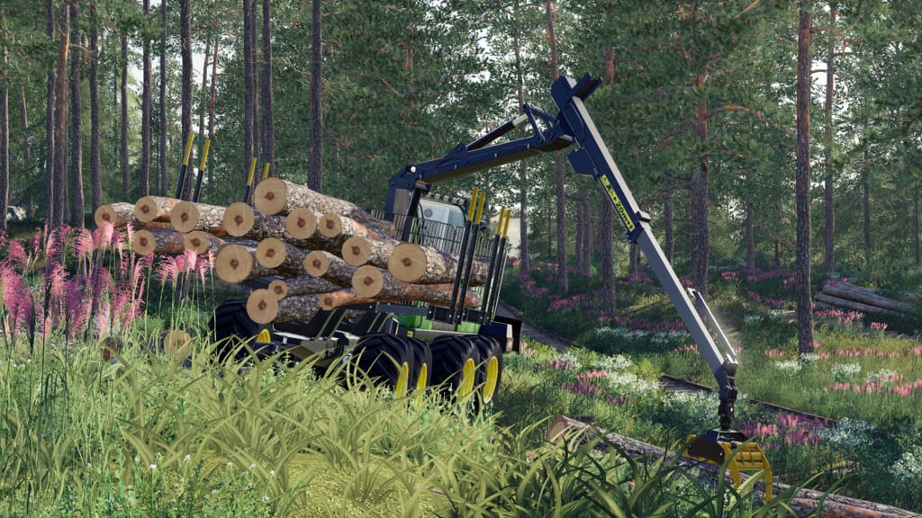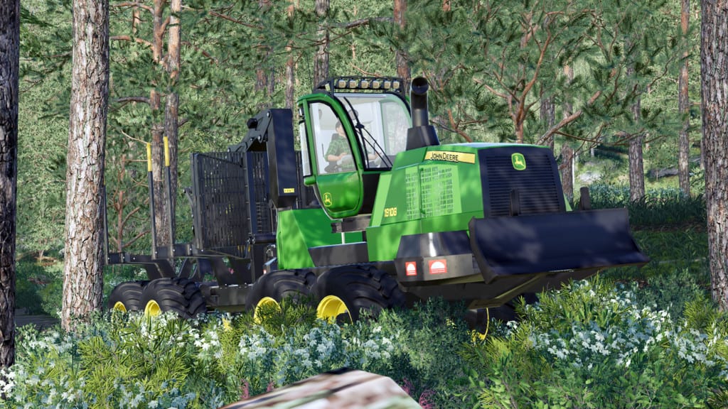The mammoth 1910G from John Deere features a low-wide bunk (VLS) that folds for transport, bigger tires for better ride comfort compared to other forwarders and higher ground clearance. Rotating, self-leveling cab turns 290 deg. for an all-around view of boom movements for efficient log loading. A powerful CF8 crane with a Deere 040 grapple