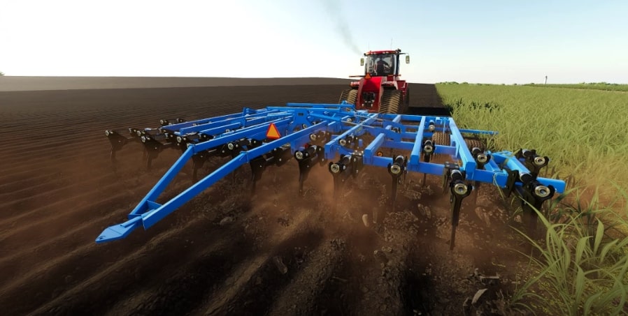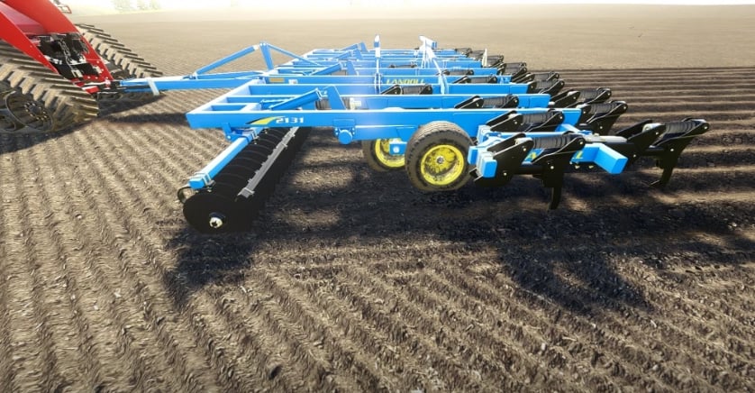 The Landoll 2131-25 is the largest coulter chisel in the 2100 series lineup outfitted with 25 shanks and a working width of 31 feet. A large machine with at least 500 hp is needed to work the 2131-25 in the field at sufficient speeds. While working, the disks in the front will cultivate the field while the shanks in the back will plow.