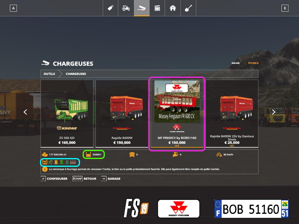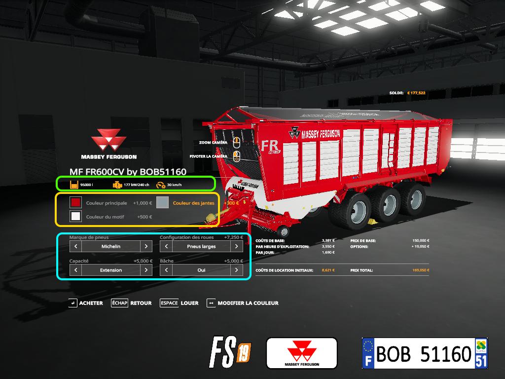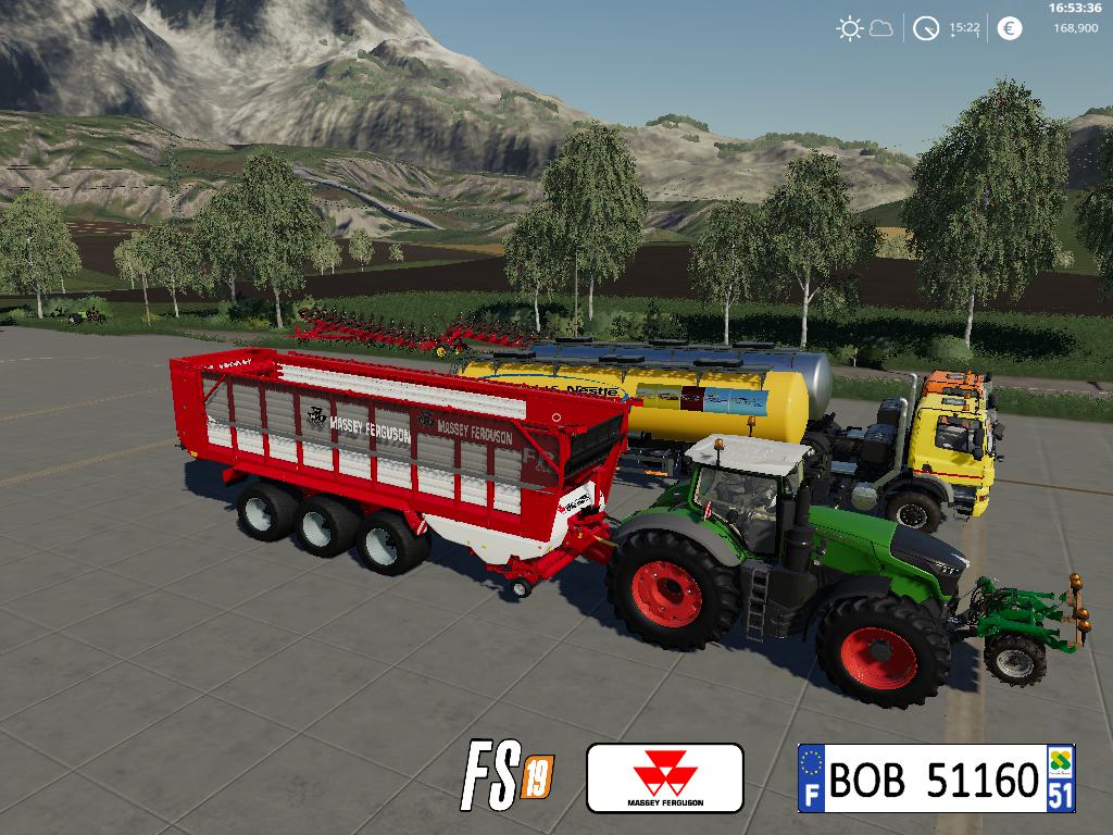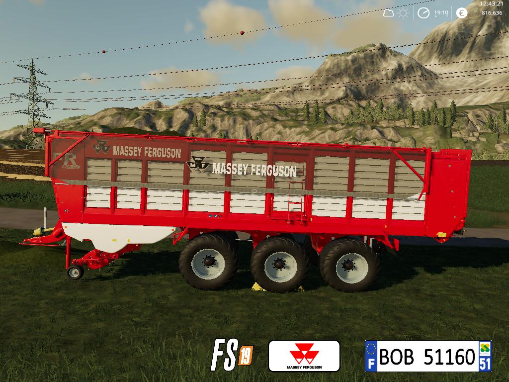 BONJOUR a tous aujourd’hui je vous présente la remorque Massey Ferguson FR600CV.elle pourra etre utiliser pour ramasser l’herbe, le foin, la paille et pour plus de renseignement voir les photos ci joint, merci a vous et bon jeu. BOB51160.