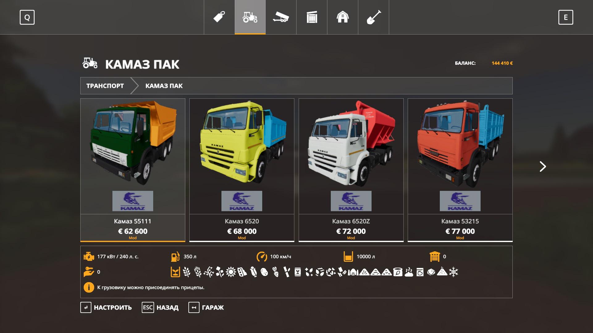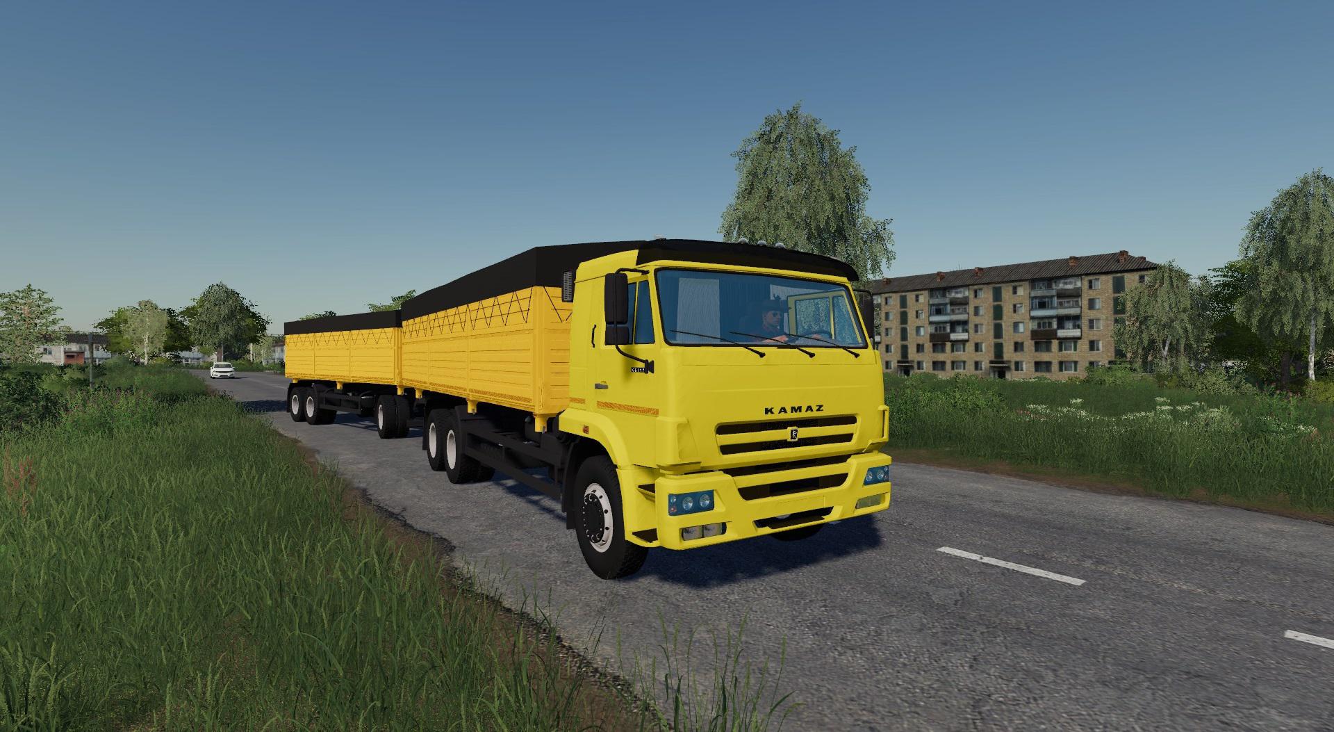 The pack includes: – KamAZ-65117 grain truck; – KamAZ-6520 ZSK; – Trailer grain truck; – KamAZ-43118 timber truck; – trailer timber; – KamAZ-54115 tractor; – Semi-trailer grain truck; – Semi-trailer timber truck; – Semi-trailer platform; – Food semitrailer; – KamAZ-53215 barrel; – trailer barrel; – KamAZ-55111 dump truck; – KamAZ-6520 dump truck; – KamAZ-53215 onboard; – Trailer Nefaz-8560; – Tank wagon; – Feldbinder ЕУТ 35.3; – Livestock semi-trailer.