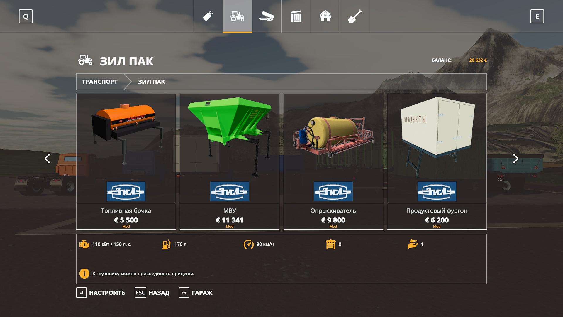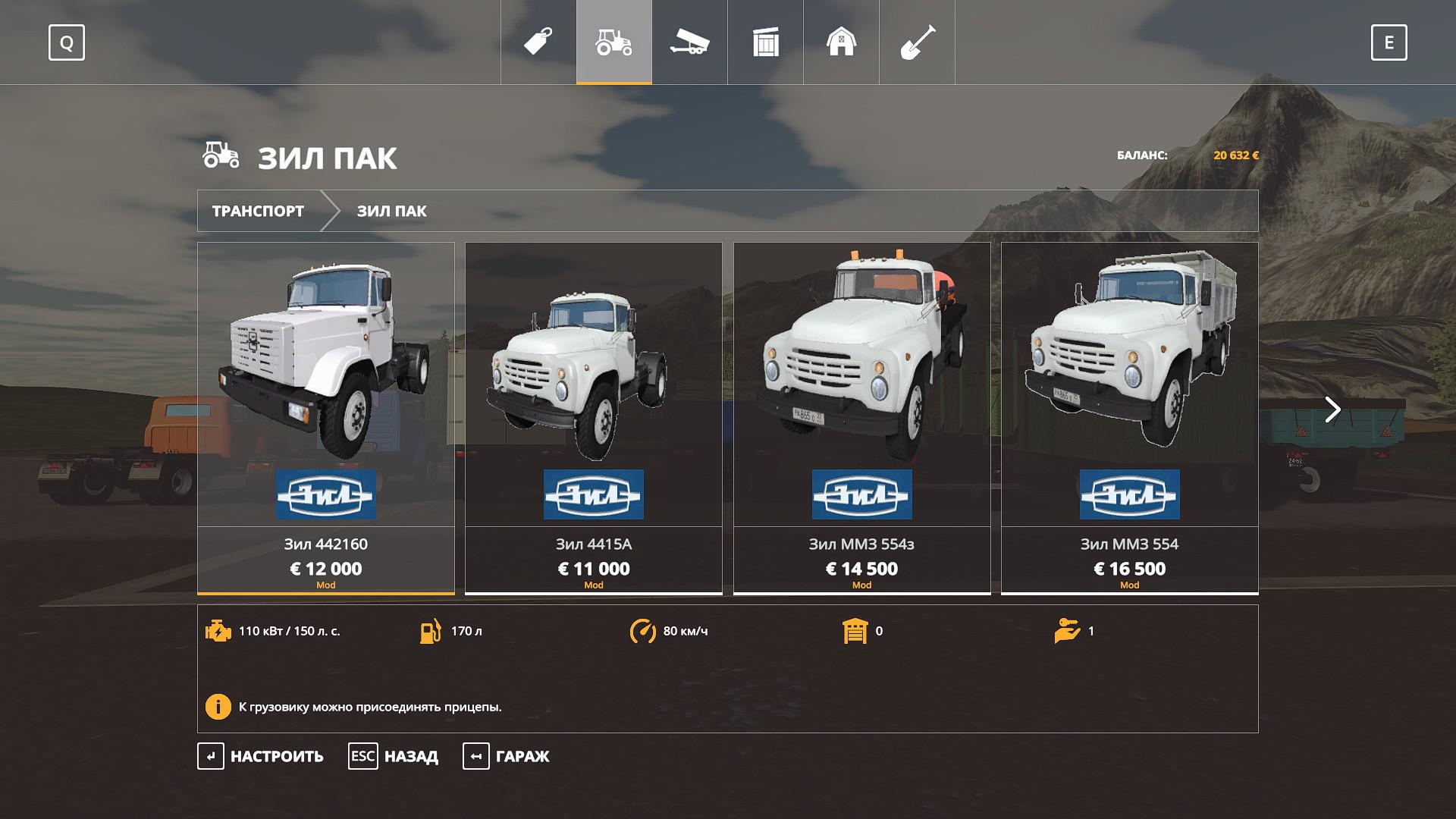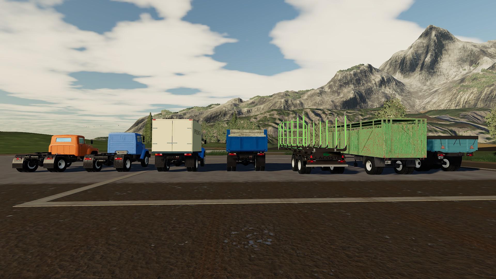 Pack includes: Trucks: – ZIL – 442160; – ZIL – 4415A; – ZIL – MMZ-554 modular; – ZIL – MMZ 554. Trailers and tanks: – GKB – 819; – ODAZ – 885; – ARUP – 8; – ARUP – 8R; – ARUP – 8 universal; – Module – fuel barrel; – timber truck; – Cattle truck; – Barrel for milk; – Module – food van; – Module – sprayer; – Module – fertilizer distributor MVU; – KAZ-717. Changes v3.2: – Added module – food van; – Various edits.