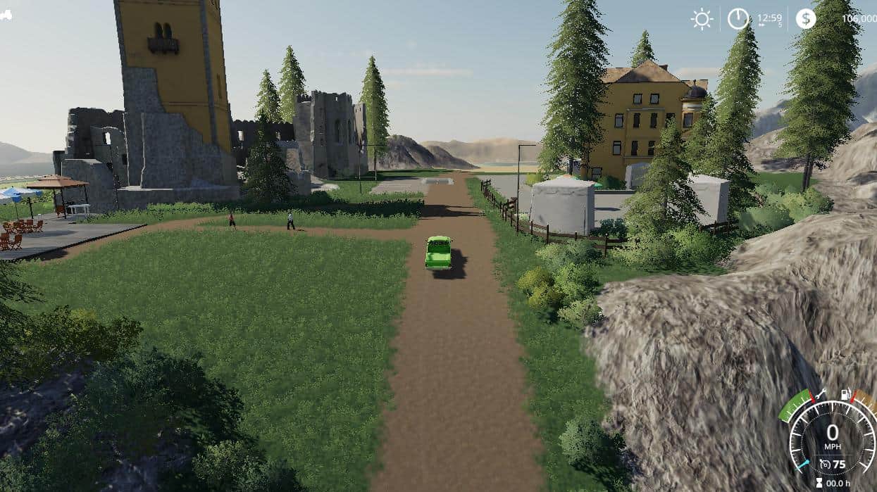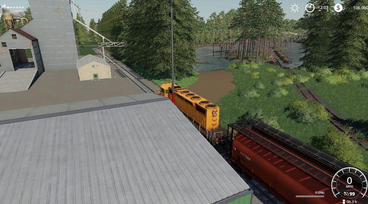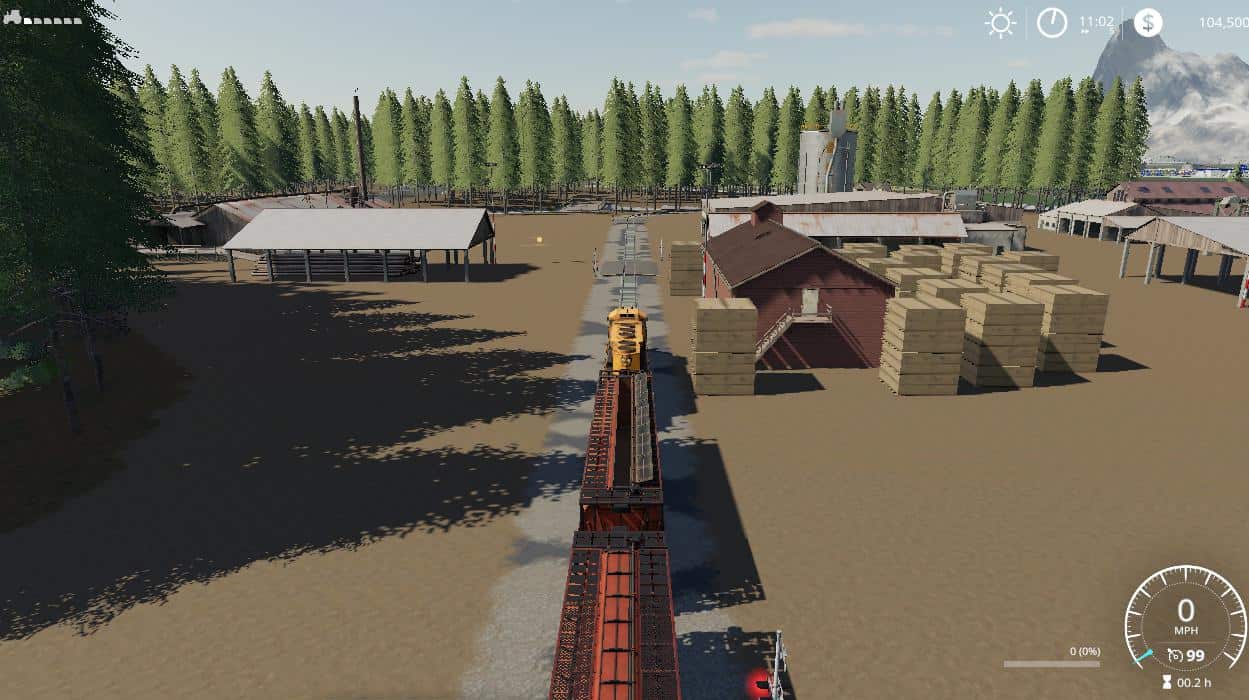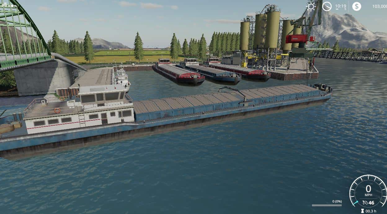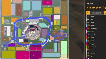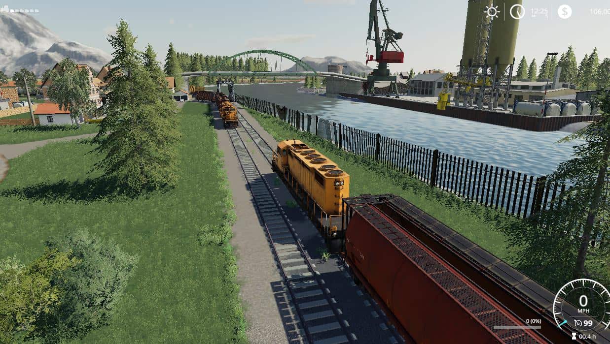 Map contains the following: 2 trains; 1 barge; 59 fields; 2 BGA’s; 3 forests: 16 custom sell points: 21 water fill triggers; 133 farmlands to purchase; working traffic and pedestrians; Standard fruits plus Sorghum, Millet, Rice, hemp, Coffee, Cranberry, Hops, Carrot, Onion, poppy, Mustard, Peanut, Rye, and Clover.; Product to mine containing a few hundred million liters each of the following material: Stone, Coal, Salt, Silt, Gravel, Ore, and Sand.