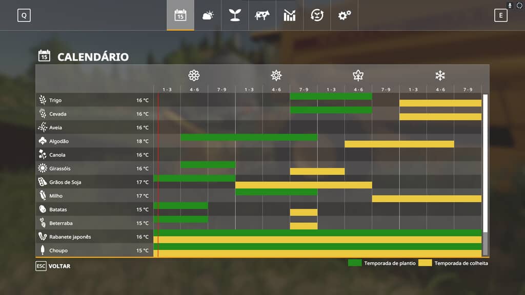 Correct planting and harvesting time for standard crops from the basegame + peanuts, rice, sorghum, off-season corn, carioca beans, black beans and coffee.