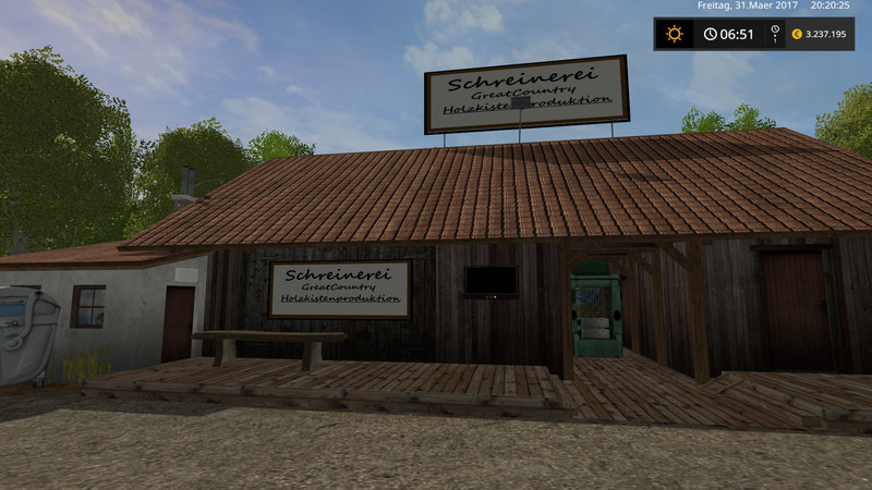 Grainmaster, Pigfoodstar, liquid fertilizer production, biodiesel production, H-milk and cheese production and the composting plant, wood processing from the pallet to the charcoal, the seedmaster, grain mill, bakery, slaughterhouse, cardboard factory, sewage mill, bakery, slaughterhouse, cardboard factory, sewage plant, charcoal production, , A workshop for the repair of your vehicles is also available, one at your farm, one at the vehicle dealer and one near the hotel. A seed and fertilizer storage is also available. Six greenhouses from lettuce to strawberries can also be found in Great Country.