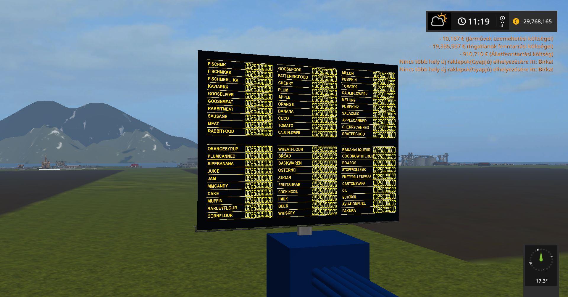 Apple applecanned aviationfuel bakery banana bananaliqueur barley barleyflour beer blackbean boards bread cabbage cake carrot cartonsvapa cauliflower cauliflower2 chaff cherry cherrycanned coco coconuwhiterum compost cookingOil corn2 cornflour cotton dryGrass_windrow emptypalletsvapa fatteningFood fertilizer Fischmehl_KK Fischman FischMKKK forage fruitsugar fuel gooseFood gooseliver goosemeat grass_windrow gratedcoco HMIL hops jam juice KaviarKK lettuce liquidFertilizer liquidManure maize manure meat melon melon2 milk millet mmcandy motoroil muffin oat oil onion orange orangesyrup osternei pakura peanut pigFood plum plumcanned potato pumpkin pumpkin2 rabbitFood rabbitmeat rape redCabbage rice ripebanana rye saladMix sausage seed silage sorghum soybean spelled stoffrolleMK straw sudangrass sugar sugarBeet sugarCane sunflower tomato tomato2 triticale water wheat wheatflour whisky wood wool woodChips
