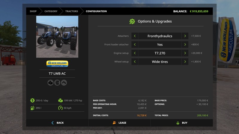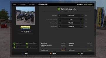 All engine configurations and numerous gearbox configurations for each model. Separate shop items for each gearbox configuration, everything else uses the new FS17 shop customization feature. Choose between; no front mounted equipment, weight holder, or 3 point hydraulic mount with PTO. Weights come as separate shop item. Frontloader console available on everything except the T8s. Numerous wheel options with fitting fenders. Custom script for cabin suspension and moving controls and levers inside cabin. Passenger script also added on all models. Dynamic hoses script.