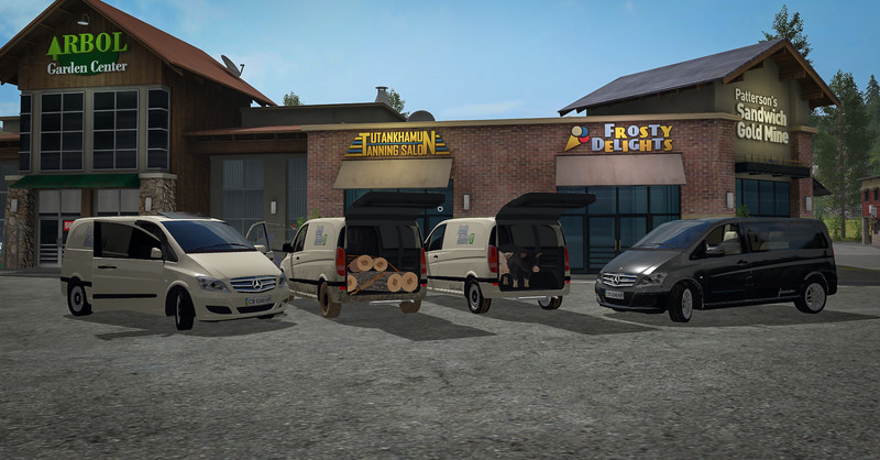 Viano for FS17. Two versions of the car. Cargo minivan will be indispensable on a small farm, as it can carry static objects, animals, and so forth. And the luxury version, titanium disks, more expensive salon, xenon, etc.